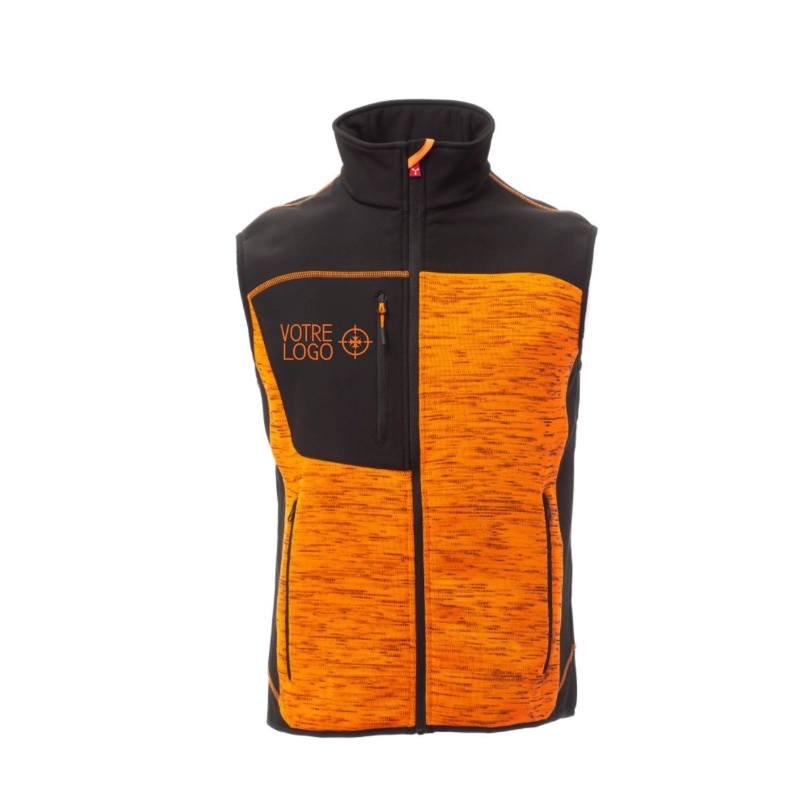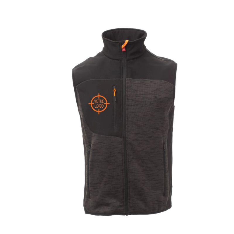Gilet en tricot technique avec inserts en soft-shell noirs, bicolore, fermeture par zip avec curseur en métal à verrouillage semi-automatique et tirette personnalisée